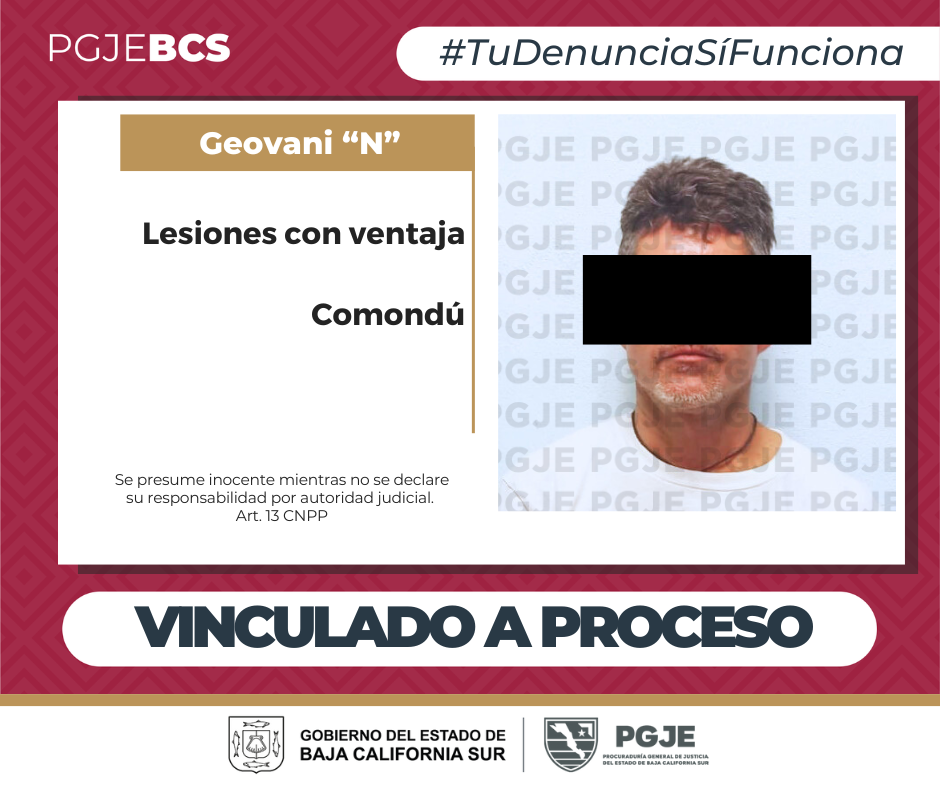 Comondú, BCS.- La Procuraduría General de Justicia del Estado (PGJE) de Baja California Sur, obtuvo la vinculación a proceso y prisión preventiva de Geovani “N” por su probable responsabilidad en el delito de lesiones calificadas con ventaja que probablemente cometió la tarde del 7 de febrero del 2024 en un domicilio ubicado en la Col. Centro en Puerto San Carlos.