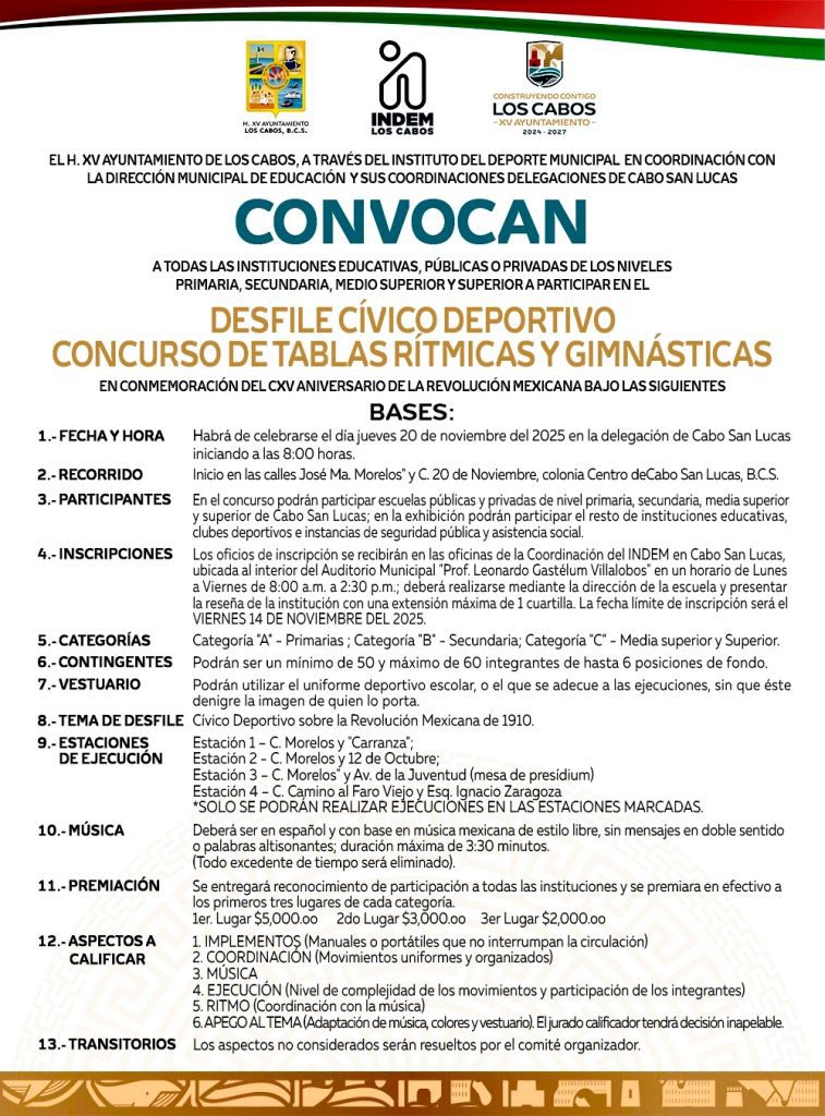 Los Cabos, Baja California Sur.- El XV Ayuntamiento de Los Cabos, a través del Instituto del Deporte del Municipio de Los Cabos (INDEM), en coordinación con la Dirección Municipal de Educación y sus coordinaciones delegacionales de Cabo San Lucas, convoca a todas las instituciones educativas públicas y privadas de nivel primaria, secundaria, medio superior y superior, así como a los clubes deportivos, a participar en el Desfile Cívico Deportivo y Concurso de Tablas Rítmicas y Gimnásticas, con motivo del 115º Aniversario de la Revolución Mexicana.
