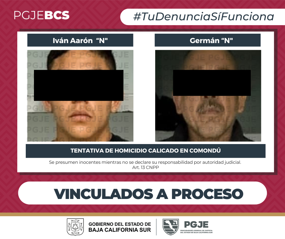 Comondú, BCS.- La Procuraduría General de Justicia del Estado (PGJE) de Baja California Sur obtuvo vinculación a proceso y prisión preventiva oficiosa en contra de Iván Aarón “N” y Germán “N”, señalados por el delito de homicidio calificado con alevosía en grado de tentativa en agravio de dos agentes de investigación criminal.
