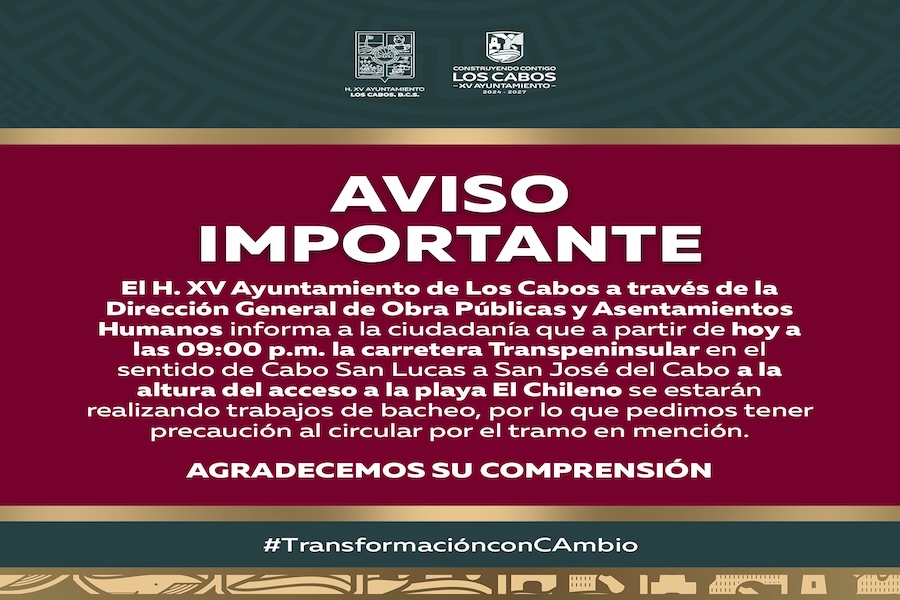 Los trabajos se desarrollarán en el sentido Cabo San Lucas–San José del Cabo, a la altura de Chileno, donde se han identificado baches de gran dimensión que requieren una intervención profunda para evitar riesgos a los automovilistas y mejorar la fluidez del tránsito; esta obra representa una atención prioritaria debido al alto flujo vehicular que diariamente se presenta en el corredor turístico.