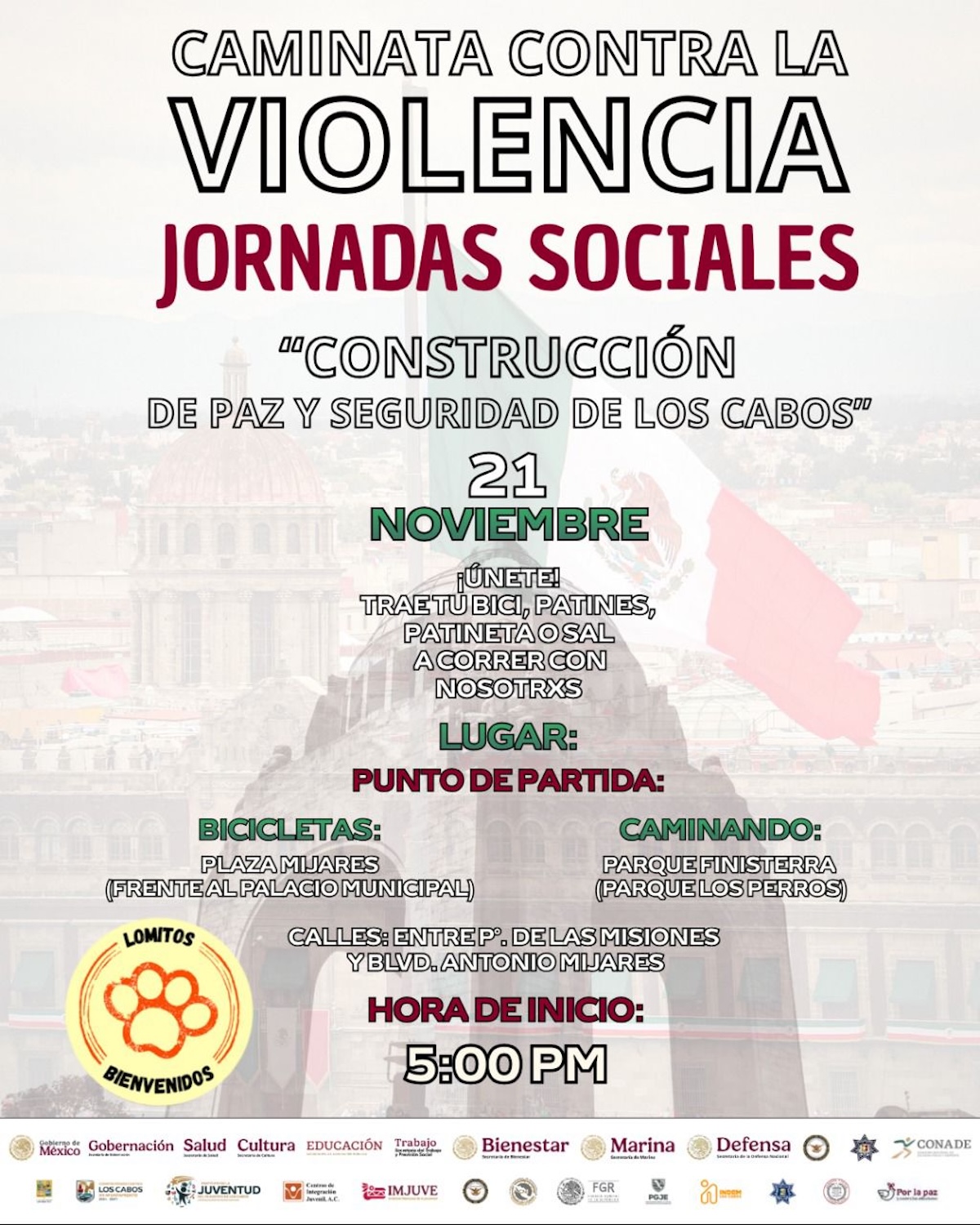 El XV Ayuntamiento de Los Cabos, a través del Instituto Municipal de la Juventud (INJUVE), convoca a la comunidad a participar en la Caminata Contra la Violencia, una actividad que forma parte de las Jornadas Sociales de Construcción de Paz y Seguridad de Los Cabos. Esta iniciativa busca fortalecer la unidad social, promover entornos seguros y fomentar la participación ciudadana en acciones que impulsen una vida libre de violencia.