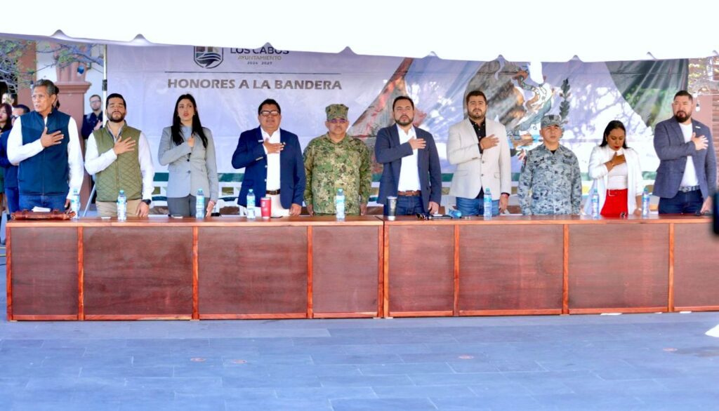 Los Cabos, Baja California Sur.– El XV Ayuntamiento de Los Cabos llevó a cabo este lunes 16 de febrero la ceremonia de honores a la bandera, encabezada por el presidente municipal Christian Agúndez Gómez; durante su mensaje, el alcalde informó sobre diversas gestiones que se impulsan para fortalecer la seguridad y la cooperación interinstitucional en beneficio de las familias cabeñas.