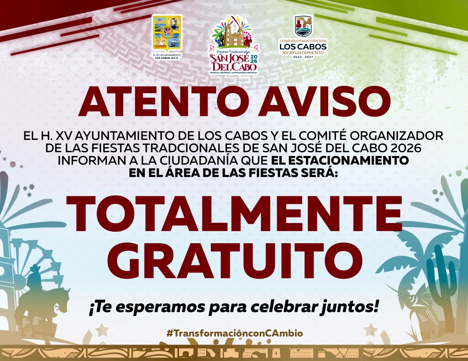 Los Cabos, Baja California Sur.– El XV Ayuntamiento de Los Cabos informa que a partir de este jueves 19 de marzo, el estacionamiento ubicado en el área donde se desarrollan las Fiestas Tradicionales San José del Cabo 2026 será de acceso gratuito para la población.