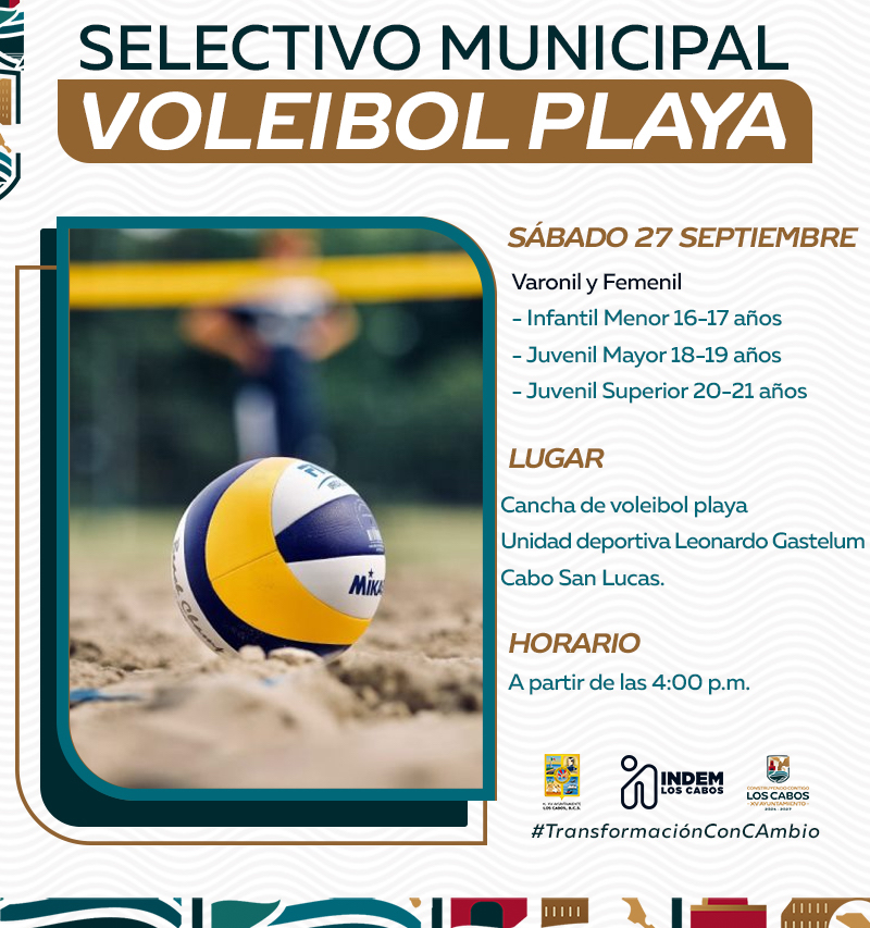 Los Cabos, Baja California Sur.- El director general del Instituto del Deporte del Municipio de Los Cabos (INDEM), Elton Olachea Arce informó que el 27 y 28 de septiembre se realizará en la delegación de Cabo San Lucas el Selectivo Municipal de Voleibol de Playa, con el objetivo de conformar a las y los atletas que representarán a Los Cabos en la fase estatal de los Nacionales Conade 2026.