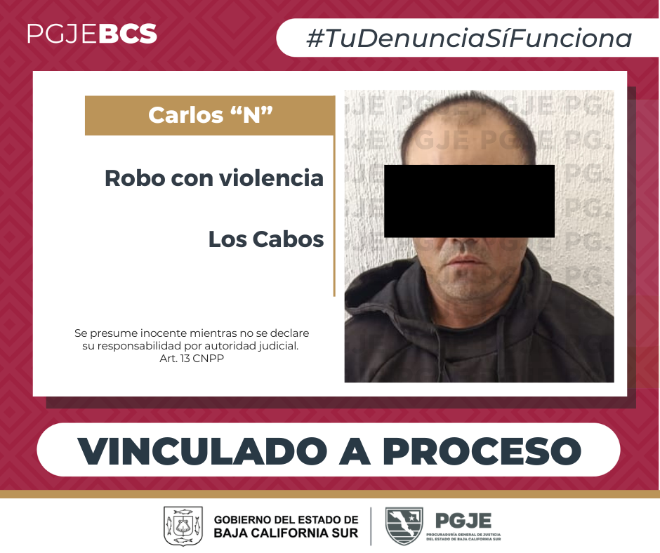 Los Cabos, BCS.- La Procuraduría General de Justicia del Estado (PGJE) de Baja California Sur obtuvo la vinculación a proceso y prisión preventiva oficiosa en contra de Carlos “N”, por su probable responsabilidad en el delito de robo calificado con violencia, cometido en un establecimiento comercial en San José del Cabo.
