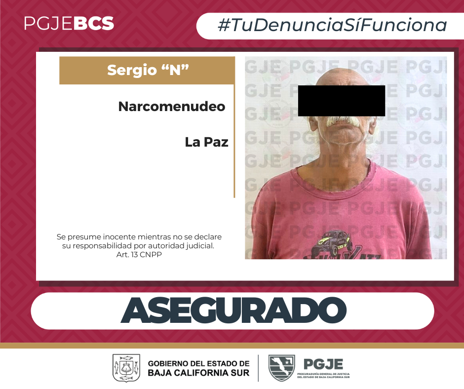 La Paz, BCS.- La Procuraduría General de Justicia del Estado (PGJE) de Baja California Sur, informa que, como parte de las acciones permanentes para combatir el narcomenudeo en la entidad, la mañana del miércoles 15 de octubre agentes de investigación lograron la detención de una persona del sexo masculino y el aseguramiento de narcótico, durante un operativo realizado en las calles Manuel Encinas y Aquiles Serdán, en la colonia Centro de La Paz.