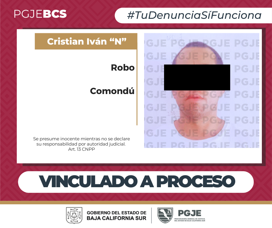 Comondú, BCS.- La Procuraduría General de Justicia del Estado (PGJE) de Baja California Sur, tendrá 2 meses para cerrar la investigación complementaria y presentar a la autoridad judicial los datos de prueba que relacionan a Cristian Iván “N”, en el delito de robo a establecimiento comercial abierto al público con violencia moral, que probablemente cometió el pasado 12 de octubre del año en curso en Ciudad Constitución.