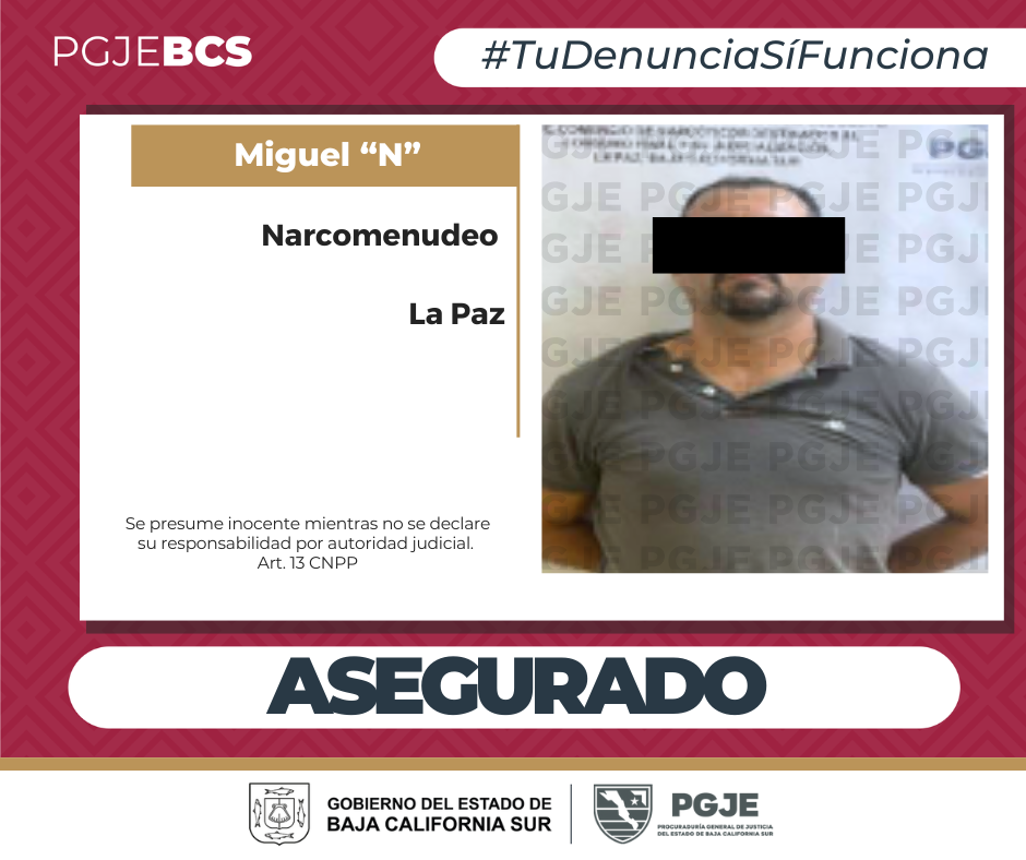 La Paz, BCS.- Durante un operativo de investigación, agentes de la Procuraduría General de Justicia del Estado (PGJE) de Baja California Sur, lograron la detención de un hombre, así como el aseguramiento de narcótico, diversos objetos y un vehículo, en hechos ocurridos la tarde del lunes 13 de octubre en la colonia Colina de la Cruz, en La Paz.