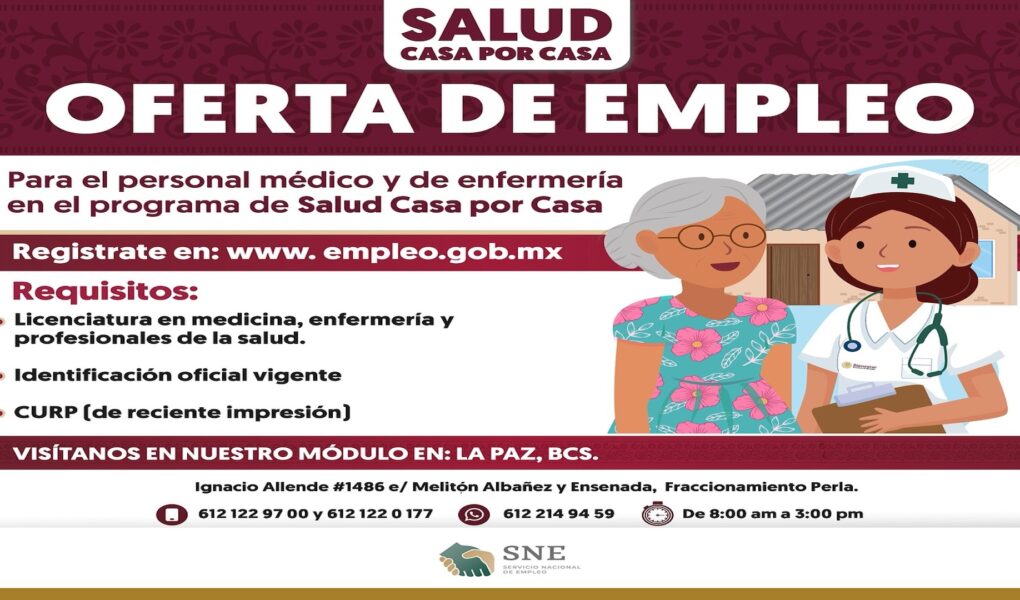 La Secretaría del Trabajo, Bienestar y Desarrollo Social (STByDS) a través del Servicio Nacional de Empleo de Baja California Sur (SNE-BCS) convoca a personal médico y de enfermería a participar