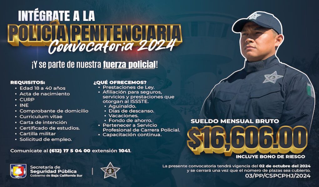 La Secretaría de Seguridad Pública del Estado (SSPE), a través del Departamento de Reclutamiento, anuncia la apertura de la Convocatoria 2024 para el perfil de Policía Penitenciario, por lo que