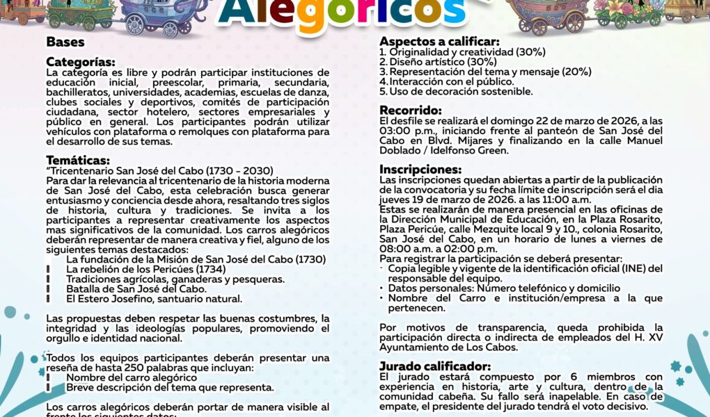 Los Cabos, Baja California Sur.– El XV Ayuntamiento de Los Cabos, en coordinación con el Comité Organizador de las Fiestas Tradicionales San José del Cabo 2026, lanzó la convocatoria para