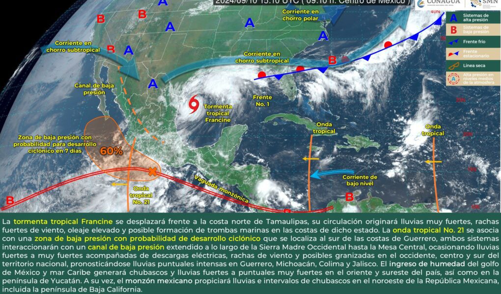 Este martes, la tormenta tropical Francine, junto con la onda tropical No. 21 y varios sistemas meteorológicos, ha provocado condiciones adversas en Baja California Sur y otras regiones del país.