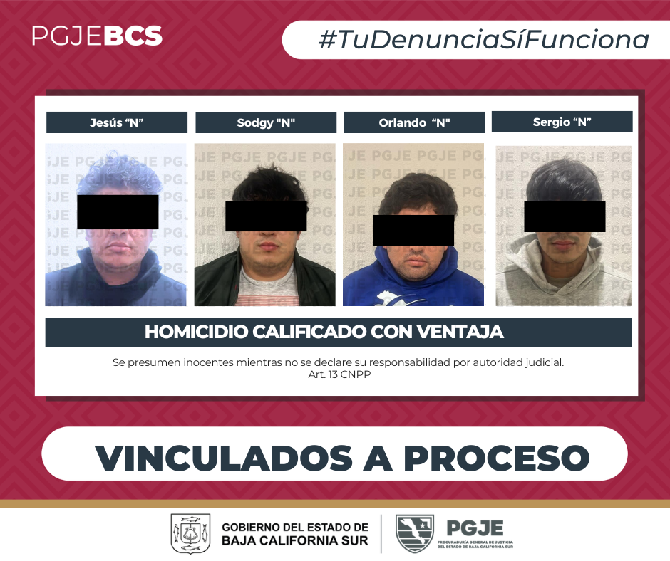 La Paz, BCS.- La Procuraduría General de Justicia del Estado (PGJE) informa que, tras presentar datos de prueba contundentes, obtuvo de un Juez de Control el auto de vinculación a proceso en contra de cuatro personas del sexo masculino, por su probable responsabilidad en el delito de homicidio calificado con ventaja.