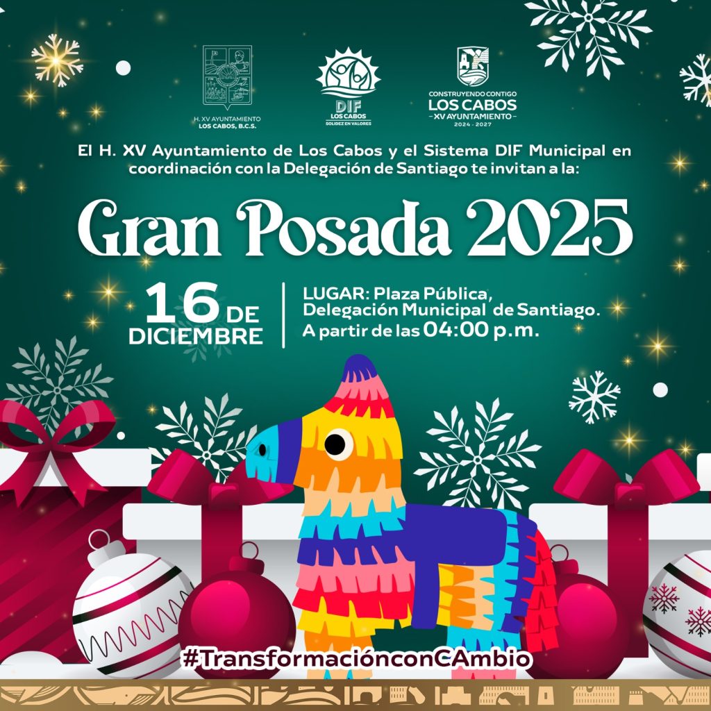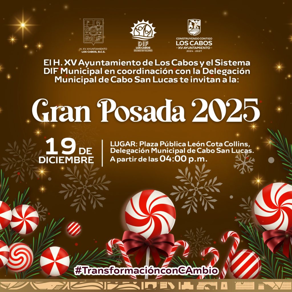 Los Cabos, Baja California Sur.- El XV Ayuntamiento de Los Cabos, en coordinación con el Sistema Municipal para el Desarrollo Integral para la Familia (DIF) y las delegaciones municipales, invita a la ciudadanía a la Gran Posada 2025, una serie de celebraciones decembrinas que se llevarán a cabo del 15 al 19 de diciembre en distintas comunidades del municipio, con el objetivo de compartir momentos de alegría, especialmente para las niñas y niños, donde puedan compartir, sonreír y vivir el espíritu de la navidad.