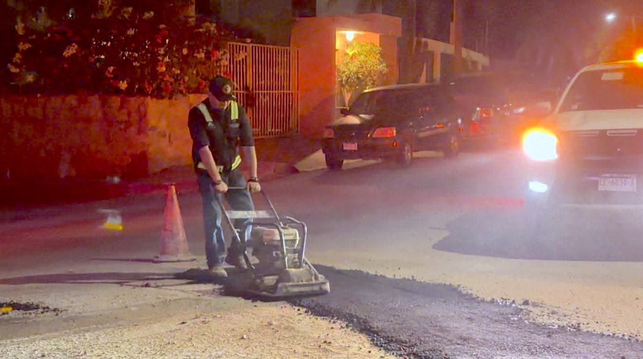 Como parte del programa “Cazabaches”, se realizaron labores nocturnas de mantenimiento vial en la calle Malvarrosa, en la colonia Magisterial de San José del Cabo, en atención a reportes ciudadanos.