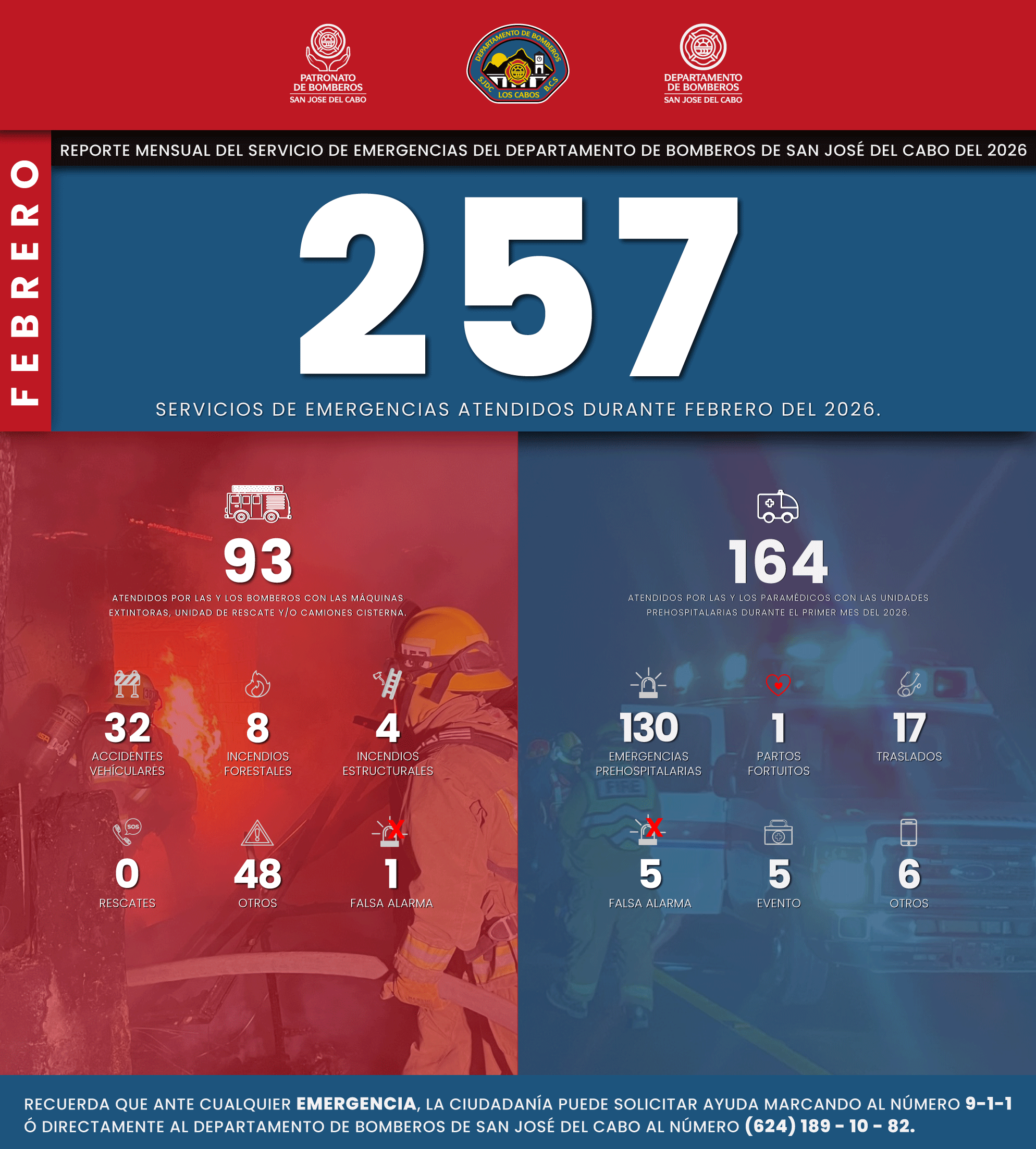Para reportar cualquier emergencia, la ciudadanía puede comunicarse al 9-1-1 o directamente al número del Departamento de Bomberos de San José del Cabo: (624) 189-10-82.