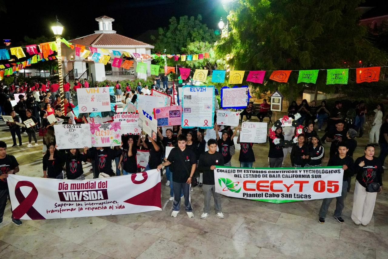 Los Cabos, Baja California Sur.- Con la participación del personal del XV Ayuntamiento de Los Cabos, instituciones educativas y diversas dependencias gubernamentales, este 01 de diciembre se llevó a cabo la Marcha Conmemorativa por el Día Mundial de la Lucha contra el VIH/SIDA, bajo el lema “Superar las interrupciones, transformar la respuesta al sida”.