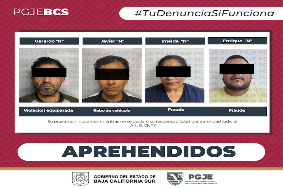 La Procuraduría General de Justicia del Estado (PGJE), realizó operativos mediante los cuales, aprehendió a 3 personas del sexo masculino y una del sexo femenino, en seguimiento a investigaciones por denuncias de actividades ilícitas en los municipios de La Paz y Los Cabos.