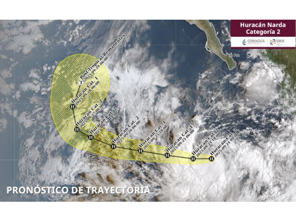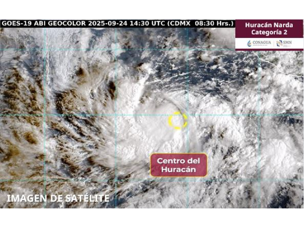 En el océano Pacífico, el ciclón tropical Narda se intensificó rápidamente y alcanzó la categoría 2 de huracán. Según datos de la Comisión Nacional del Agua (Conagua), el fenómeno presenta vientos sostenidos de hasta 165 km/h y rachas que superan los 200 km/h, además de oleaje elevado de entre 2.5 y 3.5 metros frente a las costas de Jalisco, Colima y Michoacán.