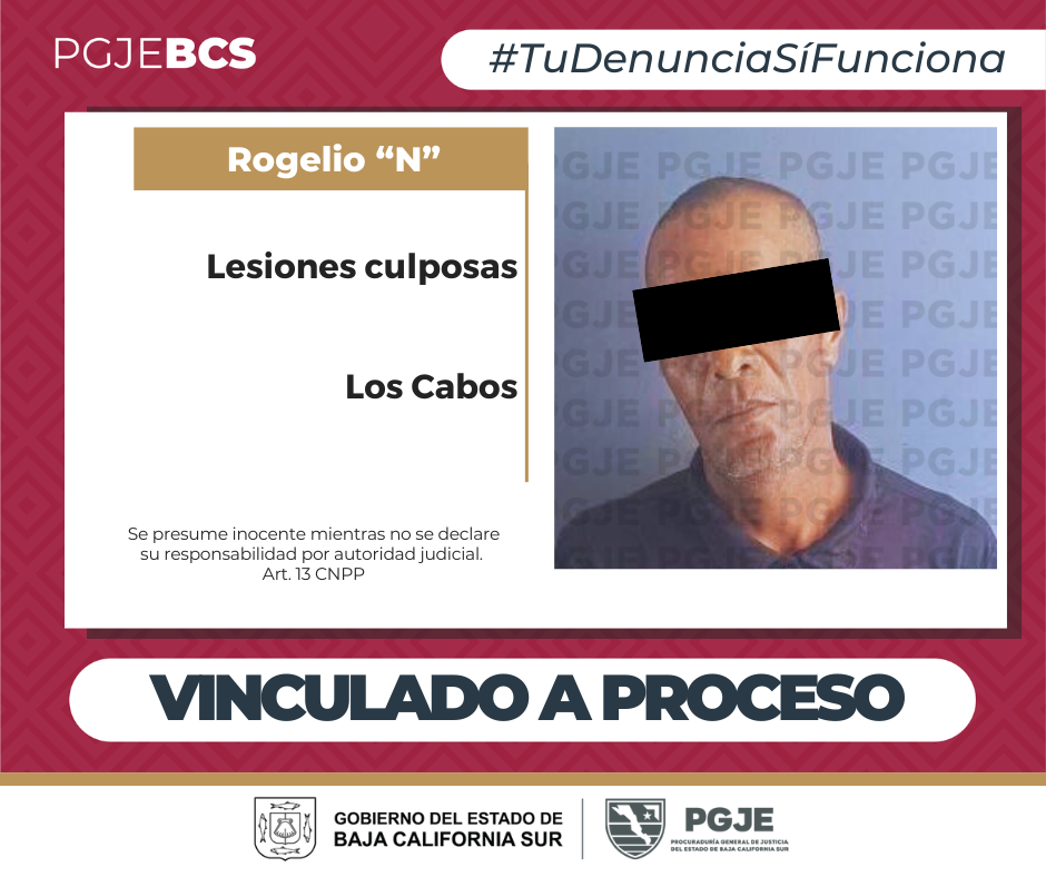 Los Cabos, BCS.- La Procuraduría General de Justicia del Estado (PGJE) de Baja California Sur informa que se inició proceso penal en contra de Rogelio “N”, por su probable responsabilidad en el delito de lesiones culposas con motivo de tránsito vehicular, en agravio de una mujer, por hechos ocurridos en Cabo San Lucas.