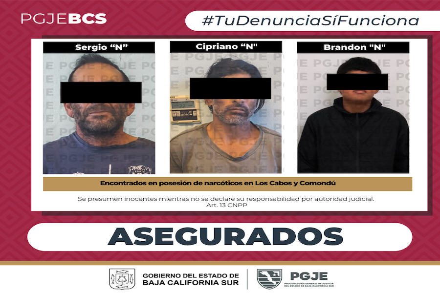 Como resultado de diversos operativos antinarcóticos, agentes de investigación de la Procuraduría General de Justicia del Estado (PGJE) de Baja California Sur, adscritos a la Subprocuraduría de Atención a Delitos de Alto Impacto (SADAI), detuvieron a tres hombres y aseguraron diversas sustancias ilícitas en los municipios de Comondú y Los Cabos.