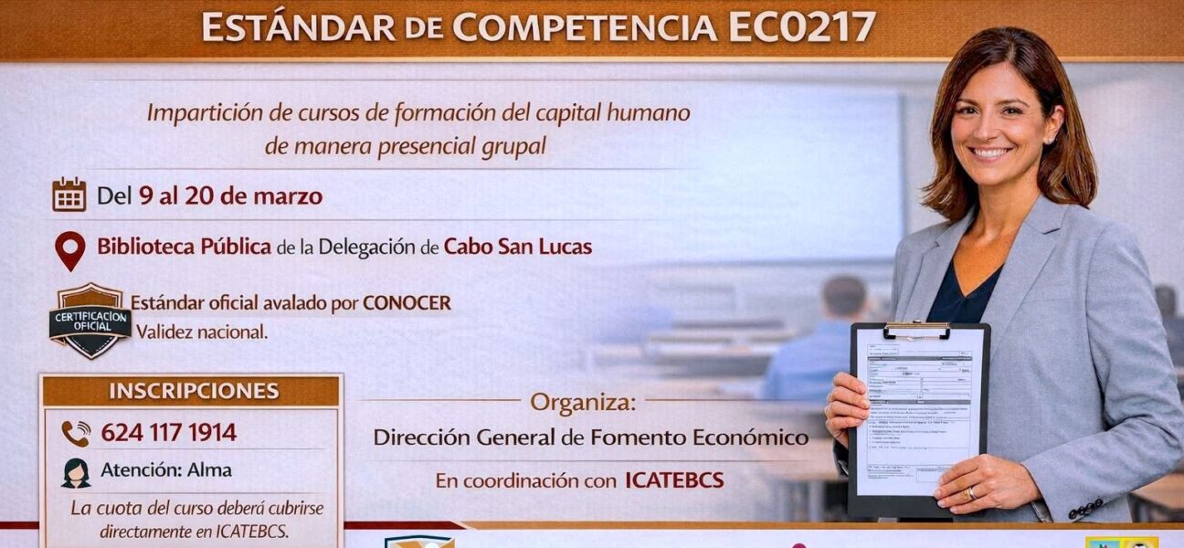 Los Cabos, Baja California Sur.– El XV Ayuntamiento de Los Cabos, a través de la Dirección General de Fomento Económico, convoca a instructores, capacitadores y profesionales de la enseñanza a.