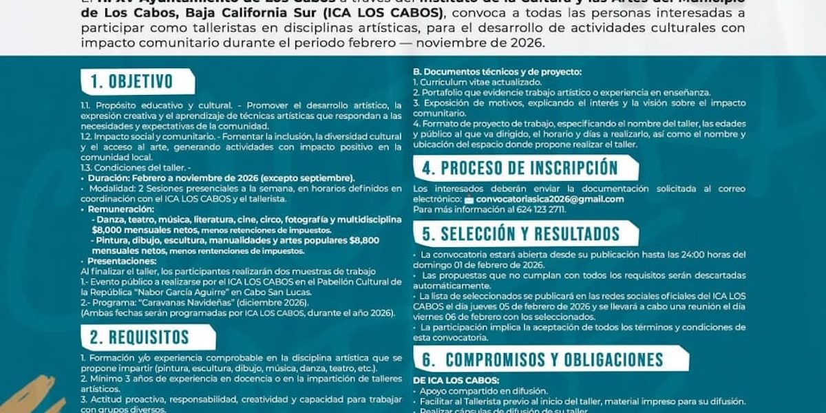 El XV Ayuntamiento de Los Cabos, a través del Instituto de la Cultura y las Artes (ICA), convoca a artistas, educadores y profesionales del ámbito cultural a participar en el.