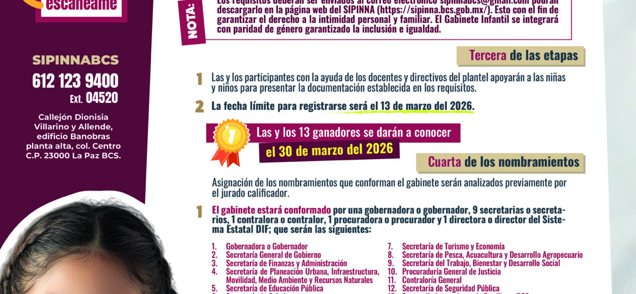 La Secretaría General de Gobierno, mediante el Sistema Estatal de Protección Integral de Niñas, Niños y Adolescentes (SIPINNA), invita a estudiantes de quinto y sexto grado de primaria del municipio.