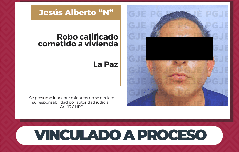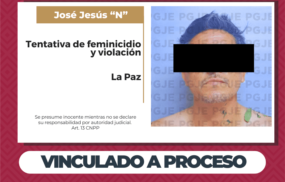 La Paz, BCS.- La Procuraduría General de Justicia del Estado (PGJE) de Baja California Sur obtuvo la vinculación a proceso y prisión preventiva de José Jesús “N” por su probable.