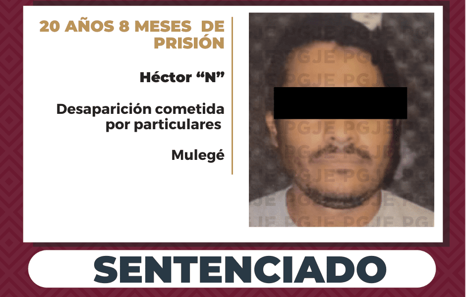 Mulegé, BCS.- La Procuraduría General de Justicia del Estado (PGJE), mediante procedimiento abreviado logró una sentencia condenatoria de 20 años 8 meses de prisión contra Héctor “N” por el delito de desaparición de persona.