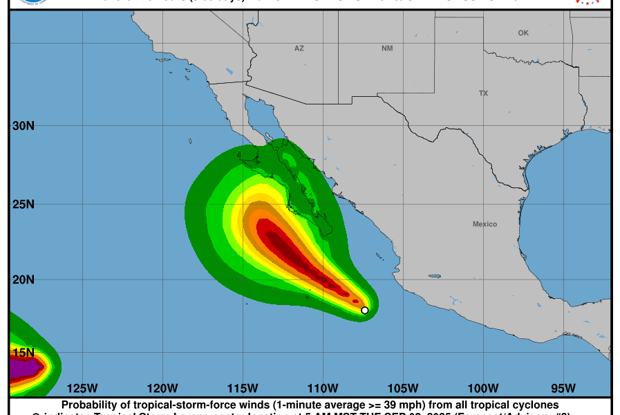 Los Cabos, BCS, 2 de septiembre de 2025. — La tormenta tropical Lorena continúa su fortalecimiento en aguas del Pacífico, al sur de Baja California Sur, y se espera que.