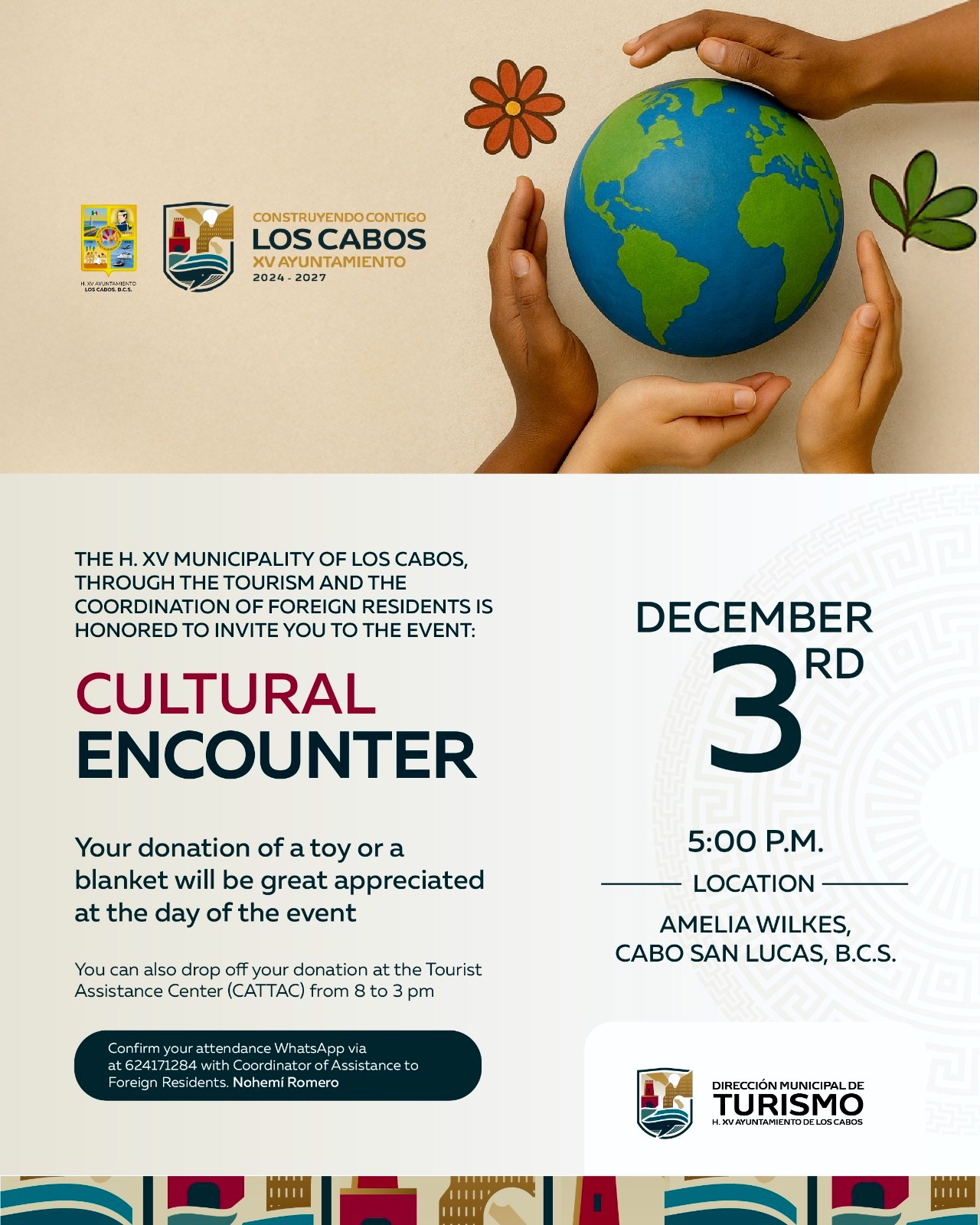 Los Cabos, Baja California Sur.- Para fortalecer la integración social y el respeto entre las distintas comunidades que conviven en el municipio, el XV Ayuntamiento de Los Cabos, a través de la Dirección Municipal de Turismo, invita a residentes nacionales y extranjeros a participar en el “Encuentro de Culturas 2025”, un espacio dedicado al intercambio, la convivencia y la celebración de la diversidad que distingue a la región.