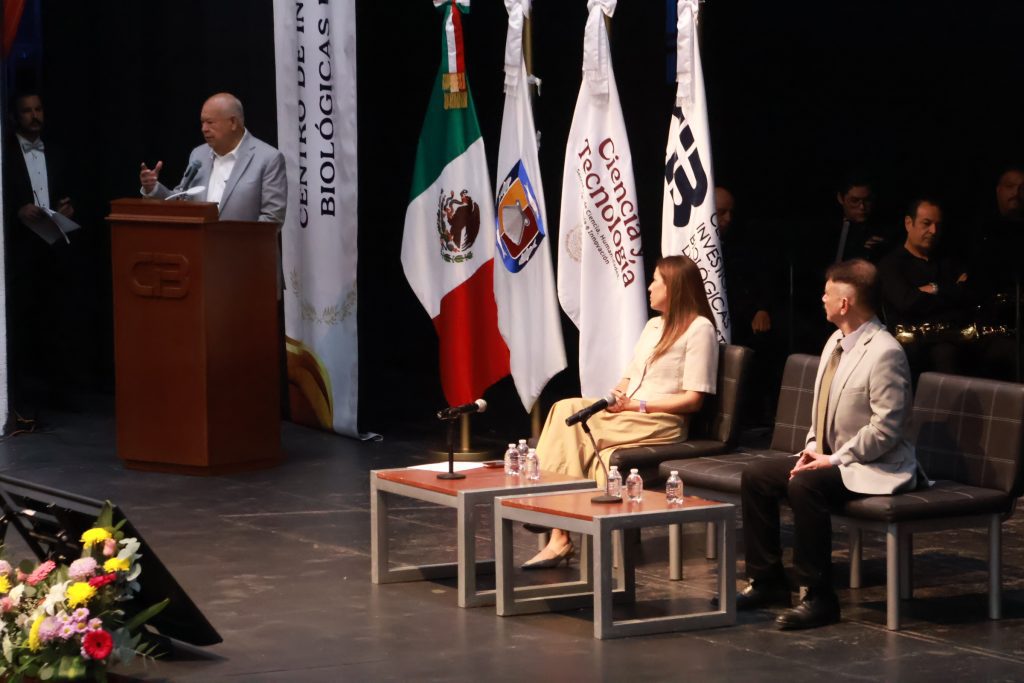 Durante la ceremonia realizada en el Teatro de la Ciudad, el mandatario subrayó que el CIBNOR ha sido un referente en la generación de conocimiento y en la aplicación de la ciencia para el bienestar de las y los sudcalifornianos. Llamó a su comunidad científica a mantener el compromiso de aplicar la investigación en beneficio del desarrollo del estado y del país.