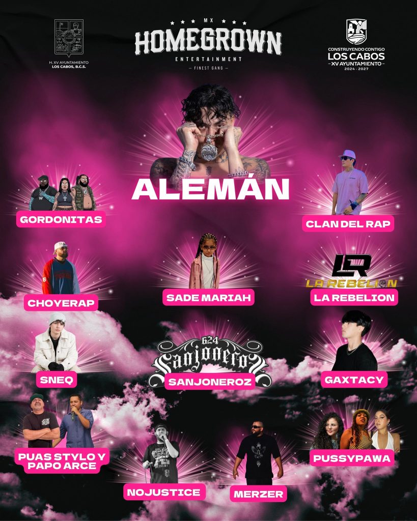 Este encuentro musical será encabezado por el reconocido rapero “Alemán”, artista originario de Los Cabos que ha puesto en alto el nombre del municipio a nivel nacional e internacional; su regreso al escenario local representa un momento significativo para la comunidad, especialmente para las juventudes que reconocen en él un referente del talento cabeño.