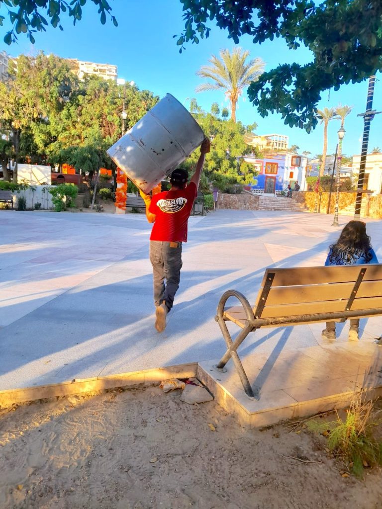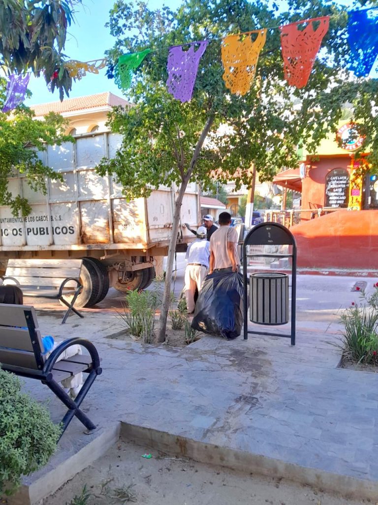 Los Cabos, Baja California Sur.- Luego de la realización de las actividades culturales y artísticas por el Día de Muertos, el XV Ayuntamiento de Los Cabos, a través de la Coordinación de Servicios Públicos, llevó a cabo una jornada integral de limpieza, recolección de residuos y sustitución de botes dañados en la plaza pública Amelia Wilkes Ceseña, en Cabo San Lucas.