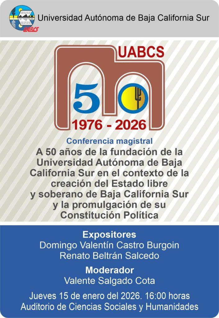 Como parte de las actividades conmemorativas por el 50 Aniversario de la Universidad Autónoma de Baja California Sur (UABCS), la institución invita a la comunidad universitaria y al público en general a la conferencia magistral “A 50 años de la fundación de la Universidad Autónoma de Baja California Sur en el contexto de la creación del Estado libre y soberano de Baja California Sur y la promulgación de su Constitución Política”.