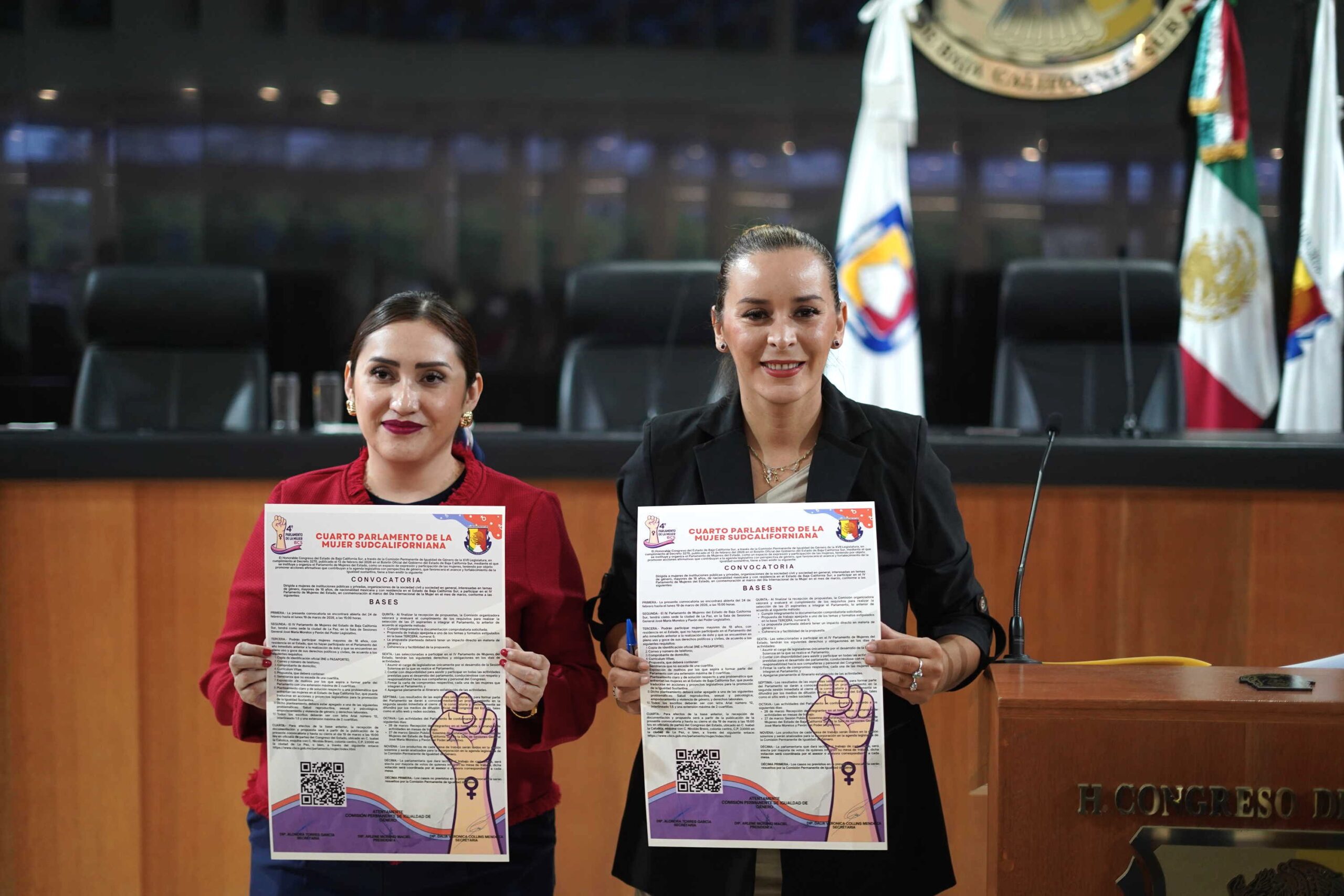 La mañana de este martes 24 de febrero, la diputada Arlene Moreno Maciel presidenta de la Comisión Permanente de Igualdad de Género en la XVII Legislatura en el Congreso del Estado de Baja California Sur, (que integra con las diputadas Alondra Torres García y Dalia Verónica Collins Mendoza), en compañía de la Dra. Claudia Gómez Sepúlveda, titular de la Unidad de Igualdad de Género en el Poder Legislativo, dio a conocer las bases de la convocatoria para participar en el 4° Parlamento de la Mujer Sudcaliforniana.