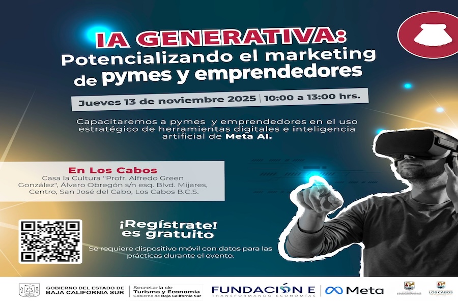 El XV Ayuntamiento de Los Cabos, a través de la Dirección General de Fomento Económico, en coordinación con la Coordinación de MIPYMES, la Secretaría de Turismo y Economía de Baja California Sur (Setue), Fundación E y Meta, invita a la comunidad emprendedora y empresarial a participar en el taller “IA Generativa: Potencializando el Marketing de Pymes y Emprendedores”.