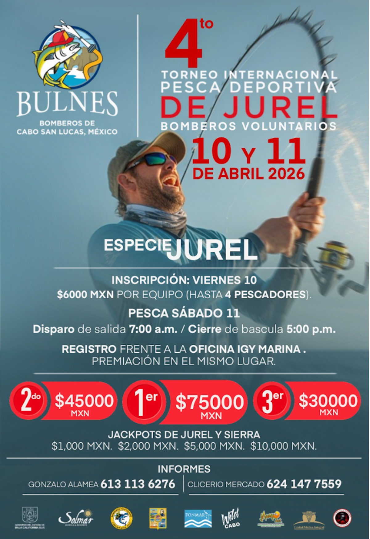 El Cuerpo de Bomberos y Rescatistas de Cabo San Lucas, a través de su Patronato, presentó de manera oficial la convocatoria y el cartel del Cuarto Torneo de Pesca Deportiva de Jurel “Bulnes” 2026, que se llevará a cabo los días 10 y 11 de abril en Cabo San Lucas, con una bolsa garantizada de 150 mil pesos en premios.