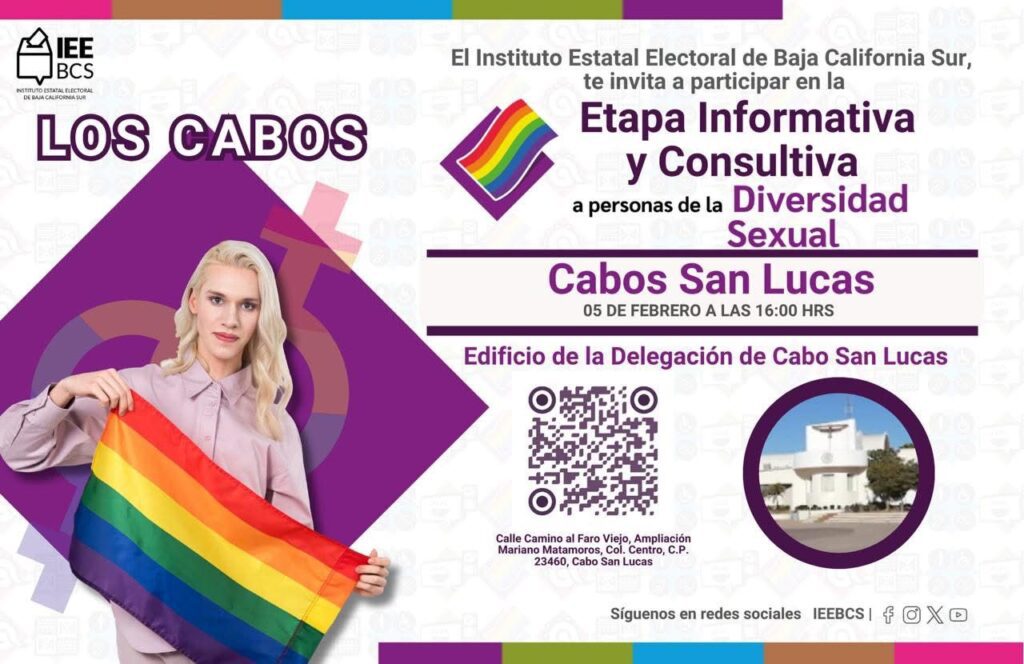 Los Cabos, Baja California Sur.- Con el firme objetivo de consolidar una democracia participativa y sin exclusiones, el XV Ayuntamiento de Los Cabos, a traves de la IV regiduria a cargo de Luz Adriana Cosío Urbina en estrecha colaboración con el Instituto Estatal Electoral de Baja California Sur (IEEBCS), informa sobre la realización de foros consultivos diseñados para garantizar y fortalecer los derechos político-electorales de la ciudadanía perteneciente a la diversidad sexual.
