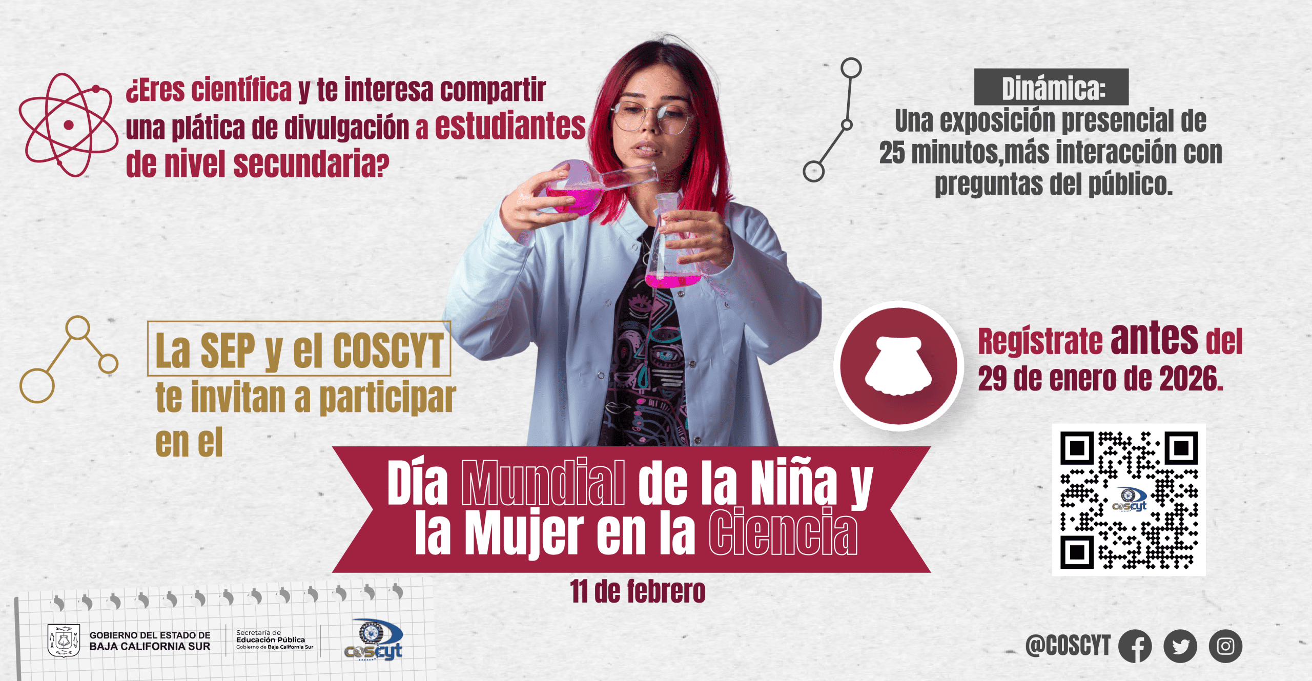 En el marco del Día Mundial de la Niña y la Mujer en la Ciencia, que se conmemora el 11 de febrero, la Secretaría de Educación Pública (SEP) y el Consejo Sudcaliforniano de Ciencia y Tecnología (COSCYT) convocan a mujeres científicas a participar en una jornada de divulgación dirigida a estudiantes de nivel secundaria.
