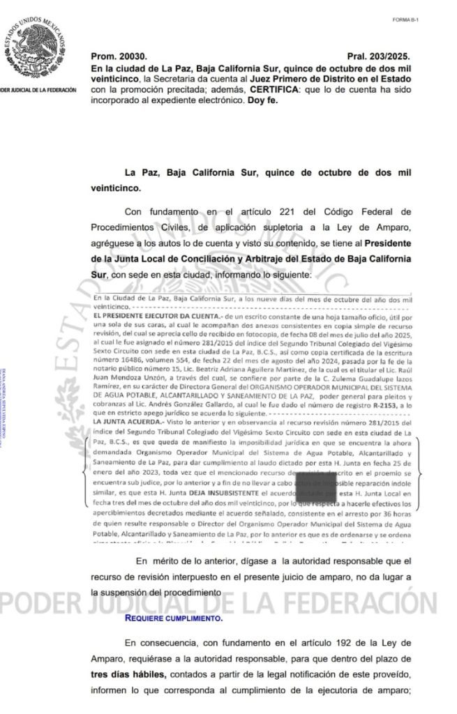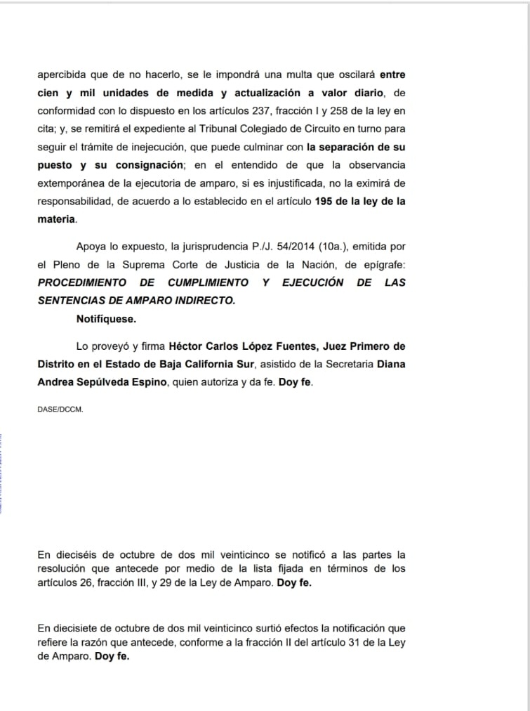 Es importante señalar que, de no cumplir la titular del OOMSAPAS La Paz con la sentencia dictada, el Juez de Distrito le abrirá un procedimiento de destitución de su cargo y consignada al Ministerio Público Federal por desacato.
