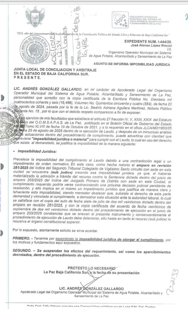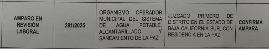 Este 20 de octubre el Segundo Tribunal Colegiado del Vigesimosexto Circuito de La Paz declaró infundado el recurso de revisión interpuesto por la Directora del Organismo Operador Municipal del Sistema de Agua Potable, Alcantarillado y Saneamiento de La Paz, Zulema Lazos Ramírez, que intentó desconocer la categoría de trabajador de base a Alonso López Rincón obtenido en un juicio laboral que además ya había sido confirmado por el mismo Tribunal Colegiado en el Juicio de Amparo Directo 566/2023, también promovido por OOMSAPAS La Paz.