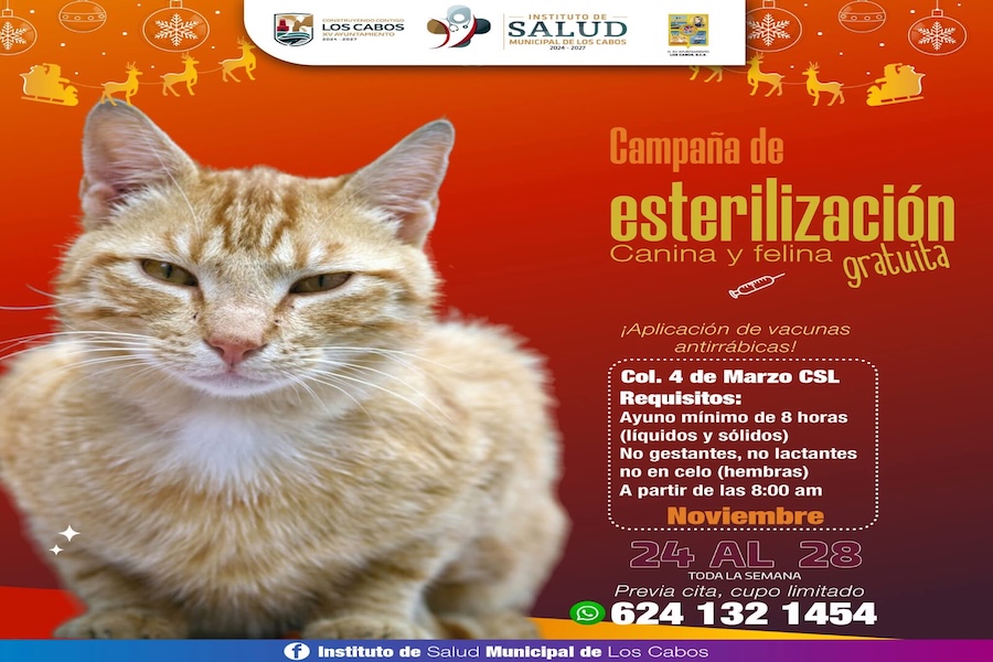 Dicha jornada, en la que además se estarán aplicando vacunas antirrábicas completamente gratuitas, tendrá lugar en la colonia 4 de Marzo, en Cabo San Lucas, a partir de las 08:00 de la mañana. El cupo es limitado.