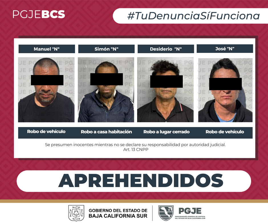 Un total de 4 mandamientos judiciales cumplimentaron elementos de investigación de la Procuraduría General de Justicia del Estado (PGJE), para lo que realizaron los respectivos operativos en los municipios de La Paz, Loreto y Mulegé el lunes 9 de febrero.