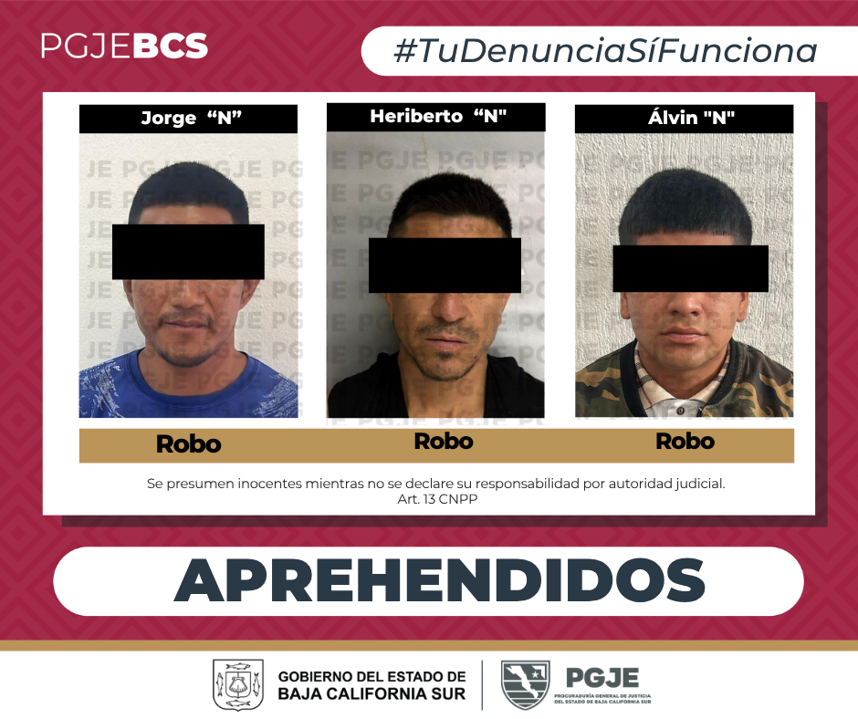 En acciones operativas orientadas a combatir la impunidad y responder a las denuncias ciudadanas, la Procuraduría General de Justicia del Estado (PGJE) de Baja California Sur, cumplimentó tres órdenes de aprehensión en contra de sujetos relacionados con diversas modalidades del delito de robo en el municipio de Los Cabos.