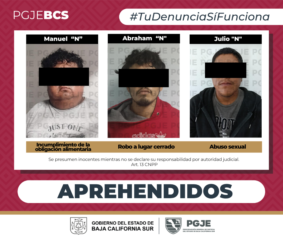Un total de 3 mandamientos judiciales cumplimentaron elementos de investigación de la Procuraduría General de Justicia del Estado (PGJE), para lo que realizaron los respectivos operativos en los municipios de Mulegé, Comondú y La Paz.