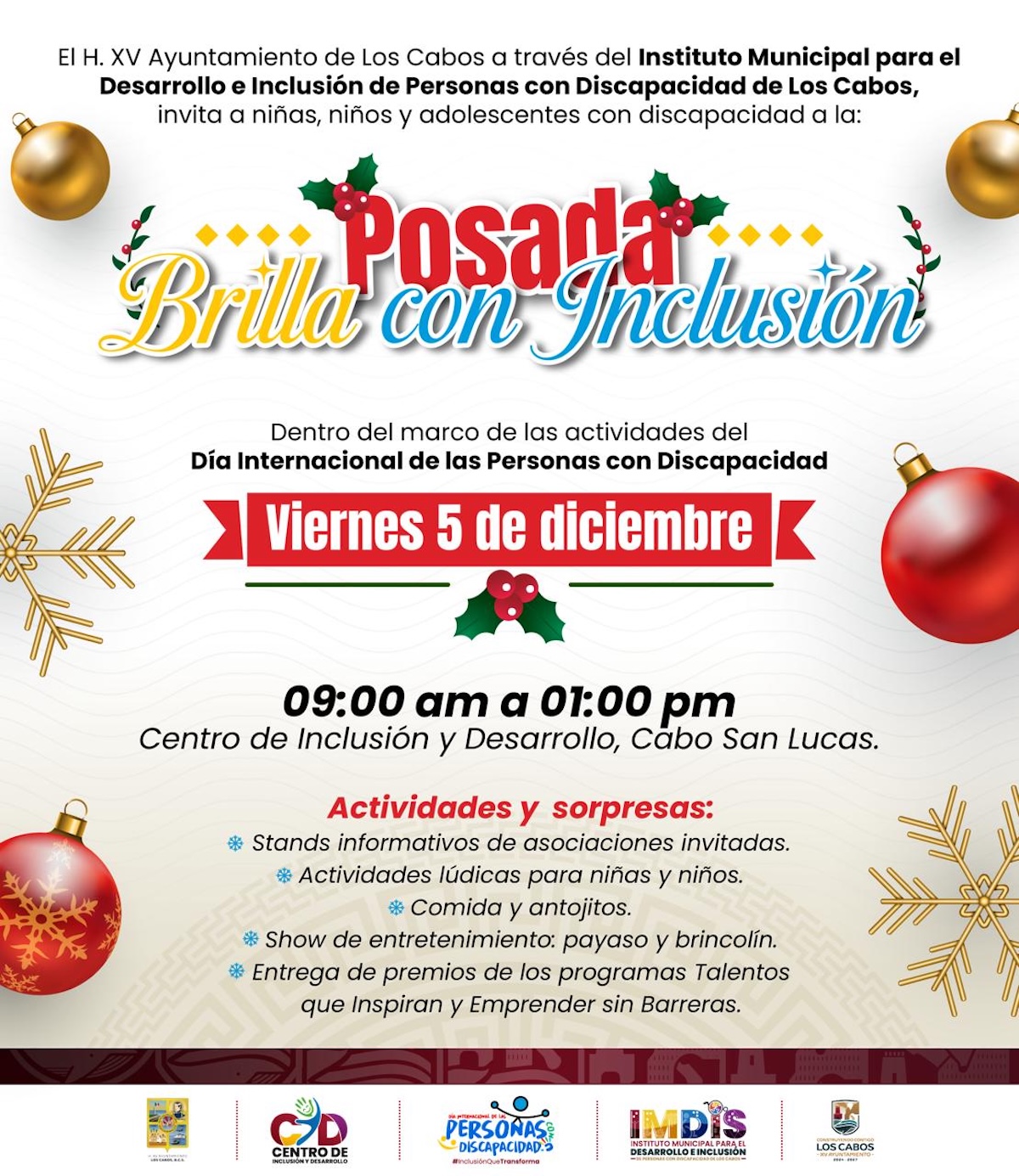 En el marco de la Semana de la Discapacidad y con el propósito de promover espacios de convivencia incluyentes para las infancias con discapacidad, este viernes 05 de diciembre se realizará la posada “Brilla con Inclusión” en el Centro de Inclusión y Desarrollo (CID) de Cabo San Lucas, a partir de las 09:00 horas. Esta actividad forma parte de las acciones del Día Internacional de las Personas con Discapacidad y está dirigida a niñas, niños y adolescentes con discapacidad, así como a sus familias.