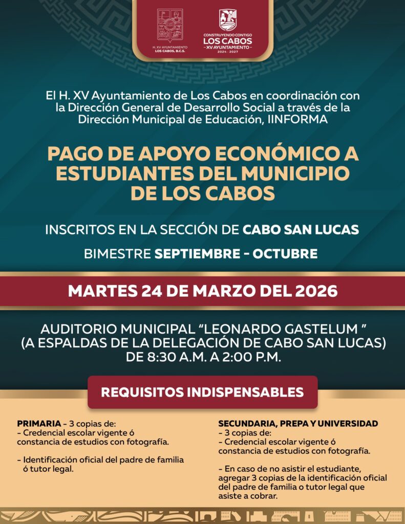 Los Cabos, Baja California Sur.– El XV Ayuntamiento de Los Cabos, en coordinación con la Dirección General de Desarrollo Social y la Dirección Municipal de Educación, informa a la comunidad estudiantil sobre la próxima entrega del pago de apoyo económico correspondiente al bimestre septiembre–octubre, que se llevará a cabo de manera simultánea en todas las delegaciones del municipio el próximo martes 24 de marzo.