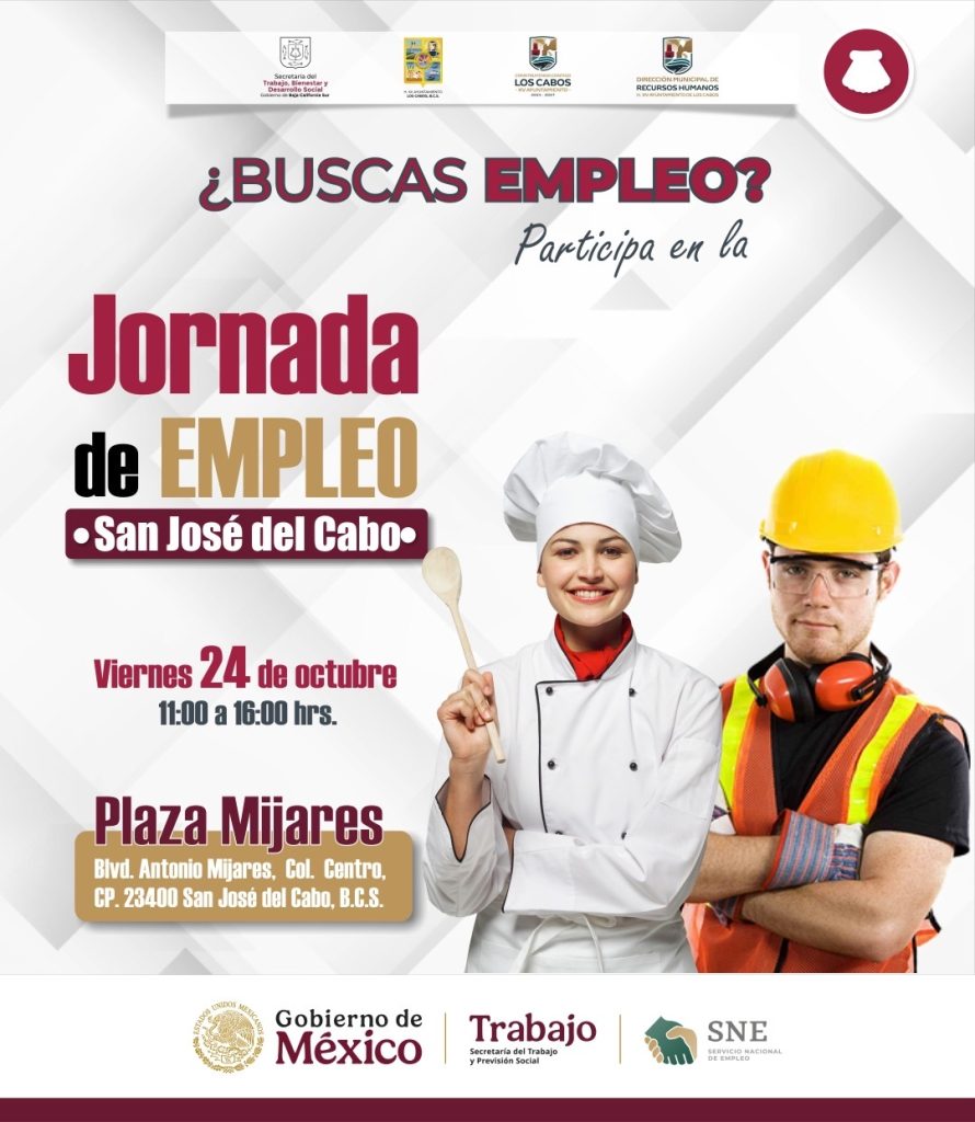 Los Cabos, Baja California Sur.– Con el propósito de impulsar oportunidades laborales y fortalecer la economía local, el XV Ayuntamiento de Los Cabos, encabezado por el presidente municipal Christian Agúndez Gómez, en coordinación con la Secretaría del Trabajo, Bienestar y Desarrollo Social del Gobierno de Baja California Sur, llevará a cabo una Jornada de Empleo el próximo viernes 24 de octubre, de 11:00 a 16:00 horas, en la plaza Teniente Antonio Mijares, en San José del Cabo.